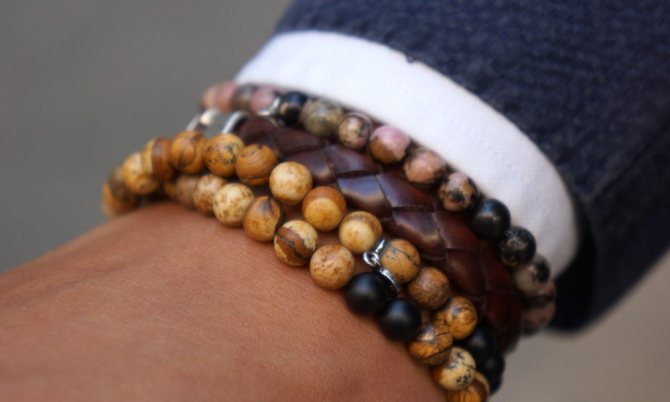 Бусины на тонкой резинке или кожаном шнурке – тренд последних сезонов. Мужчинам лучше выбирать изделия из натуральных камней, металла, кости или дерева. Они подходят для повседневного комплекта одежды или для образа в этническом стиле.