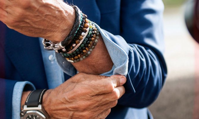 - учитывайте свое телосложение и объем кисти: высоким и крупным мужчинам с широкими ладонями подходят массивные украшения, худощавым людям с тонкими запястьями – узкие и легкие;